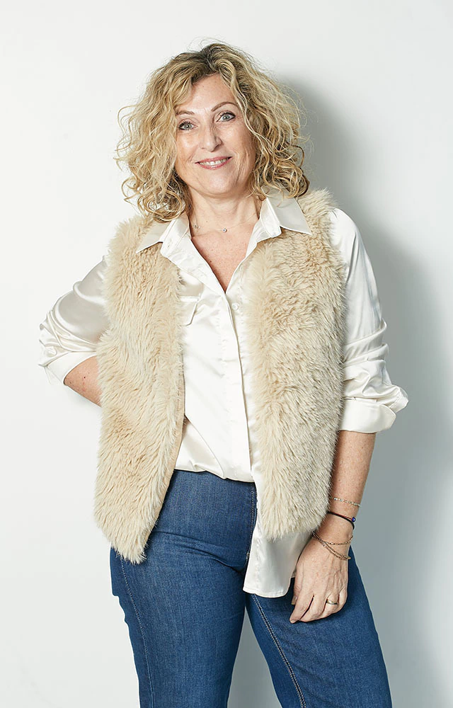 Camisa satin con dos bolsillos simulados, abotonadura escondida y tablón en la espalda.