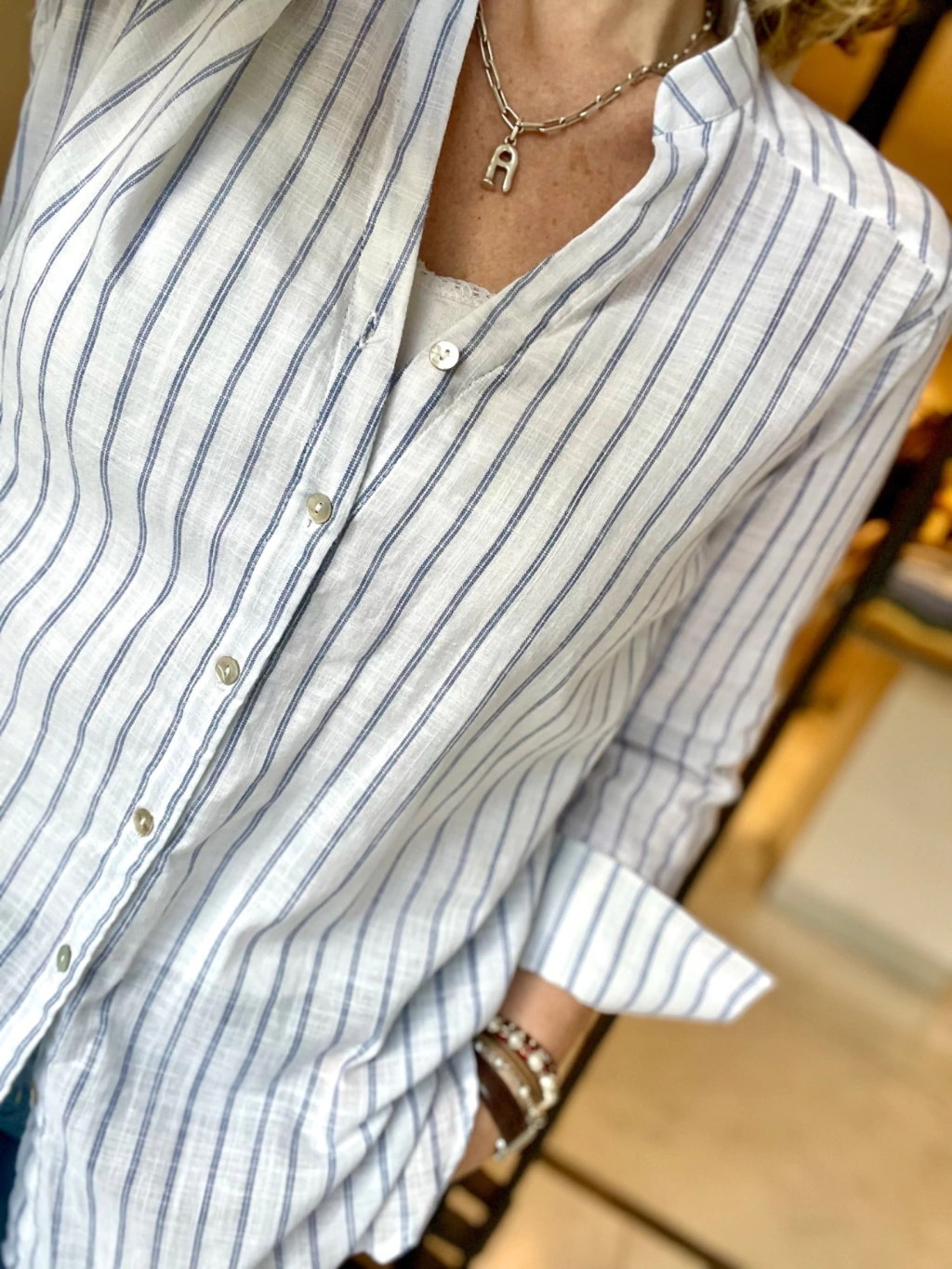 Camisa de lino cuello mao manga 3/4 con puño ancho y botones de nácar. Ruedo redondeado con tajos