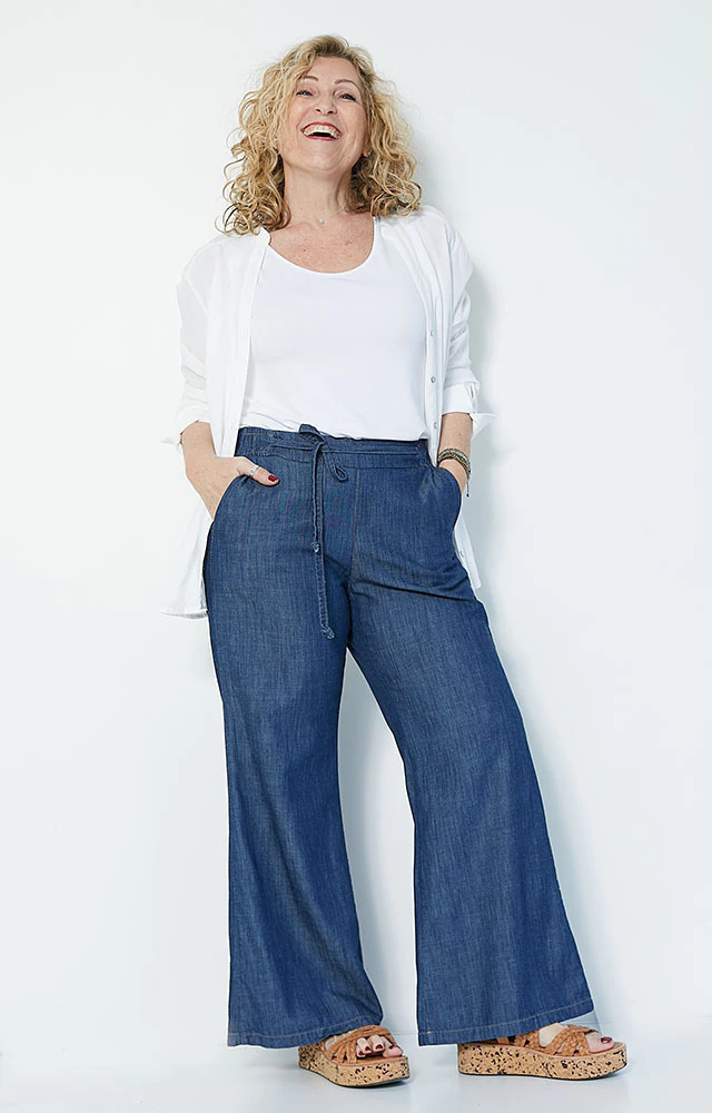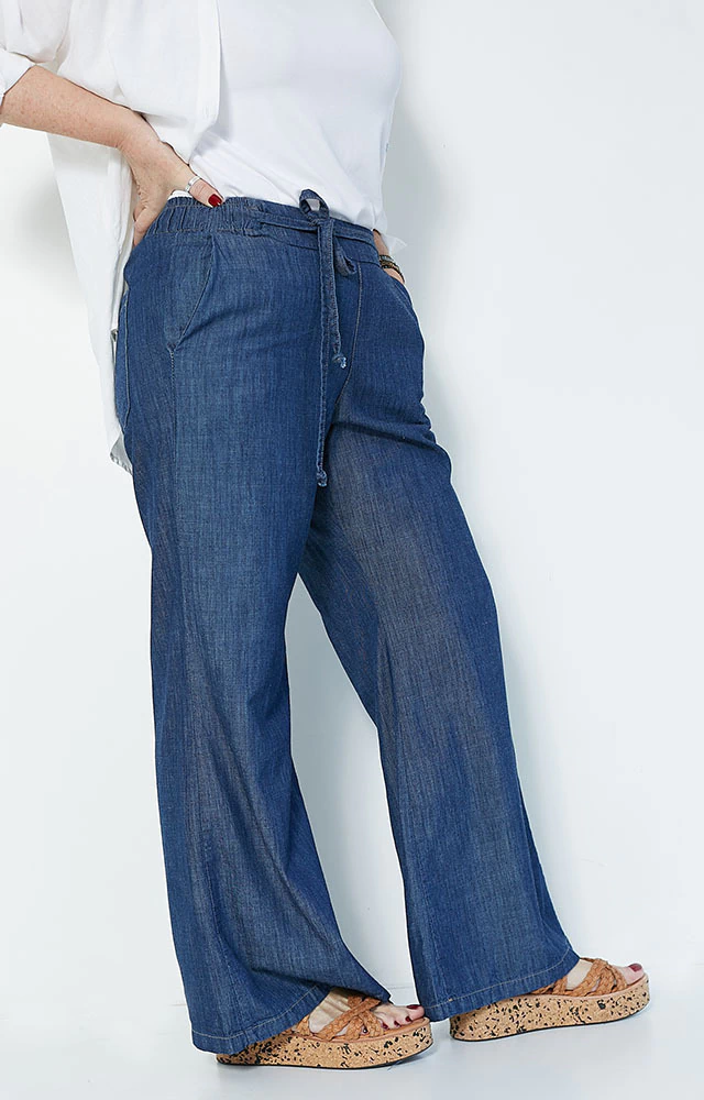 Pantalón muy liviano, en jeans de algoón, con cintura medio elástico, dos bolsillos, suelto.