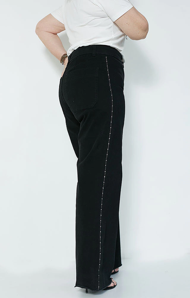 Pantalón en gabardina de algodón con detalle de pequeñas tachitas laterales, con calce espectacular, tipo wide leg, no tan ancho, tiro alto y desflecado.