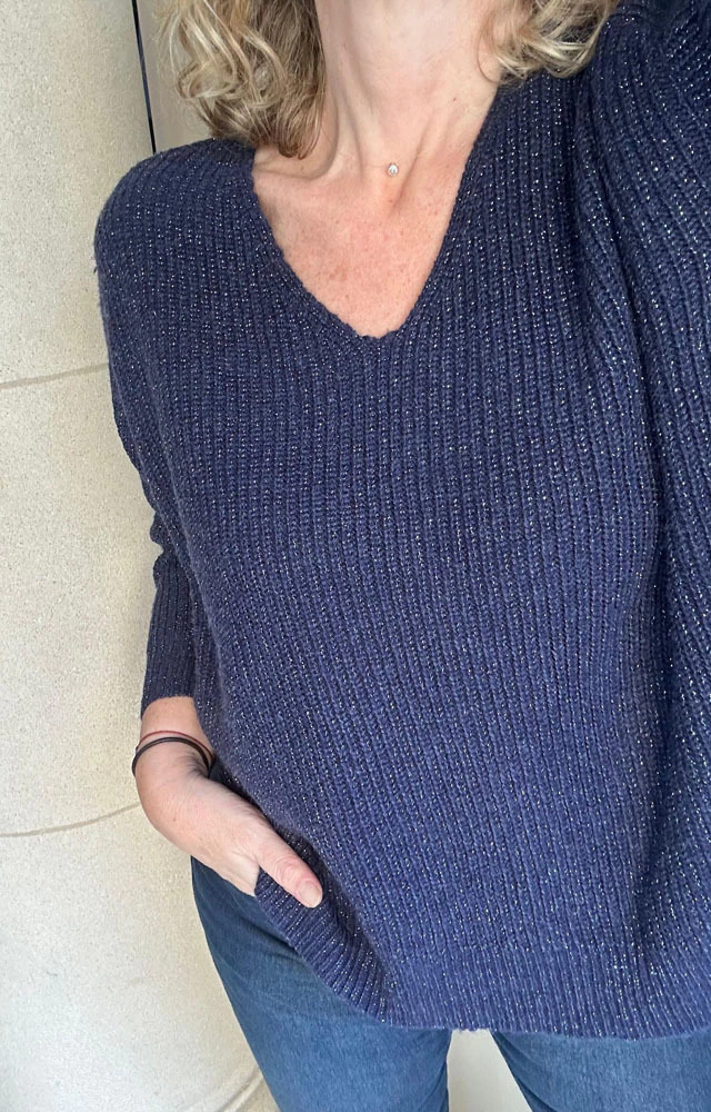 Sweater tejido con lurex al tono siendo esta particularidad lo que lo hace tan distinguido y canchero. Escote en V, manga larga y con pequeños tajos laterales. Divino!