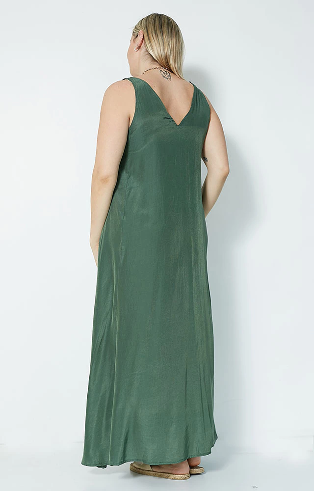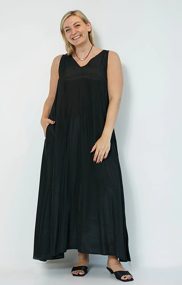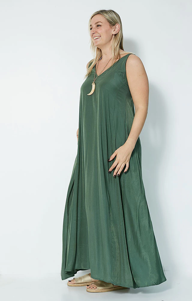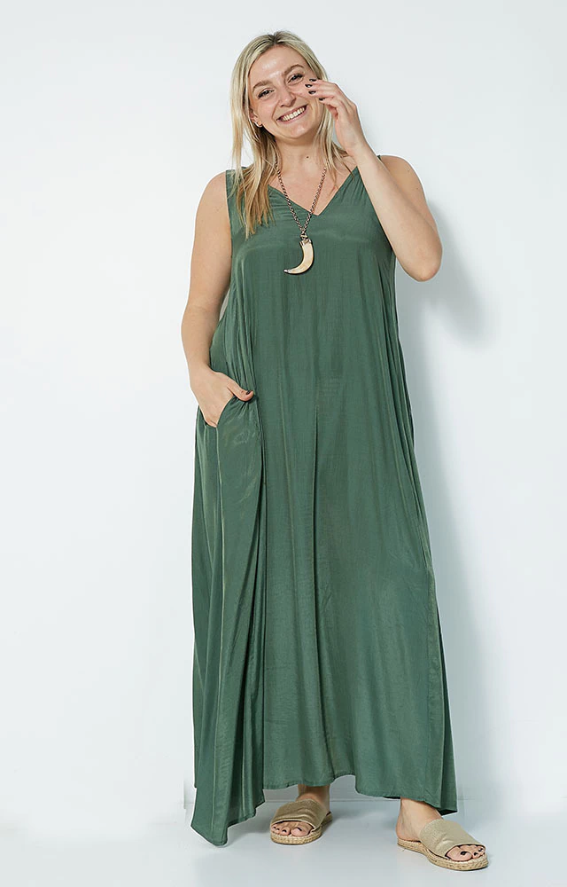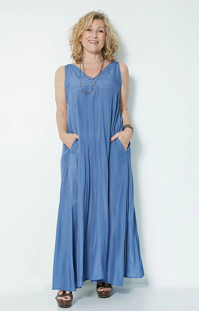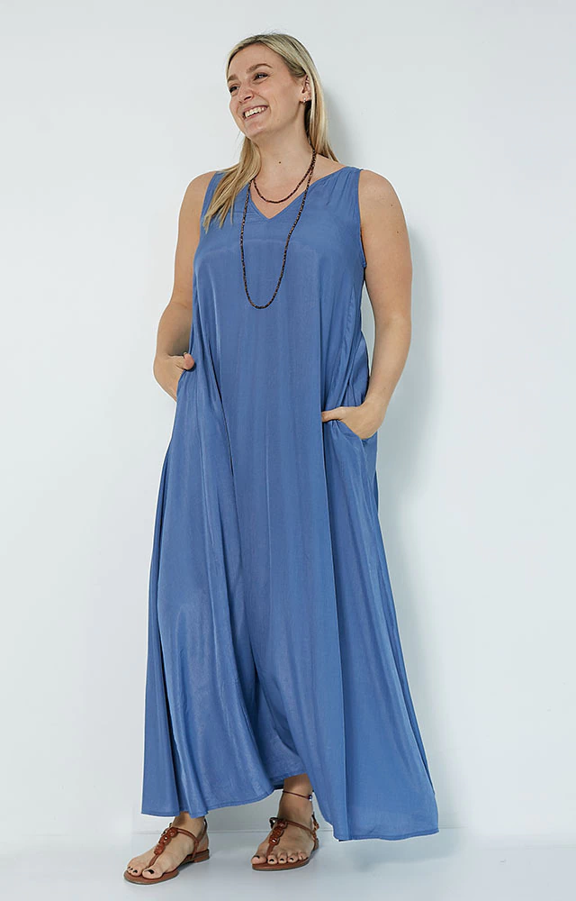 Vestido largo, evasé que otorga mucha comodidad,sin mangas, breteles anchos,escote en V adelante y atrás, dos bolsillos.