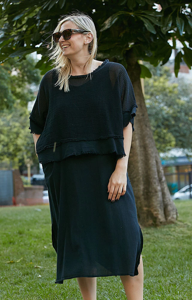 Espectacular este conjunto en lino de dos piezas compuesto por vestido sin mangas tipo musculosa, con dos bolsillos y tajos laterales y un remerón súper canchero tipo red.